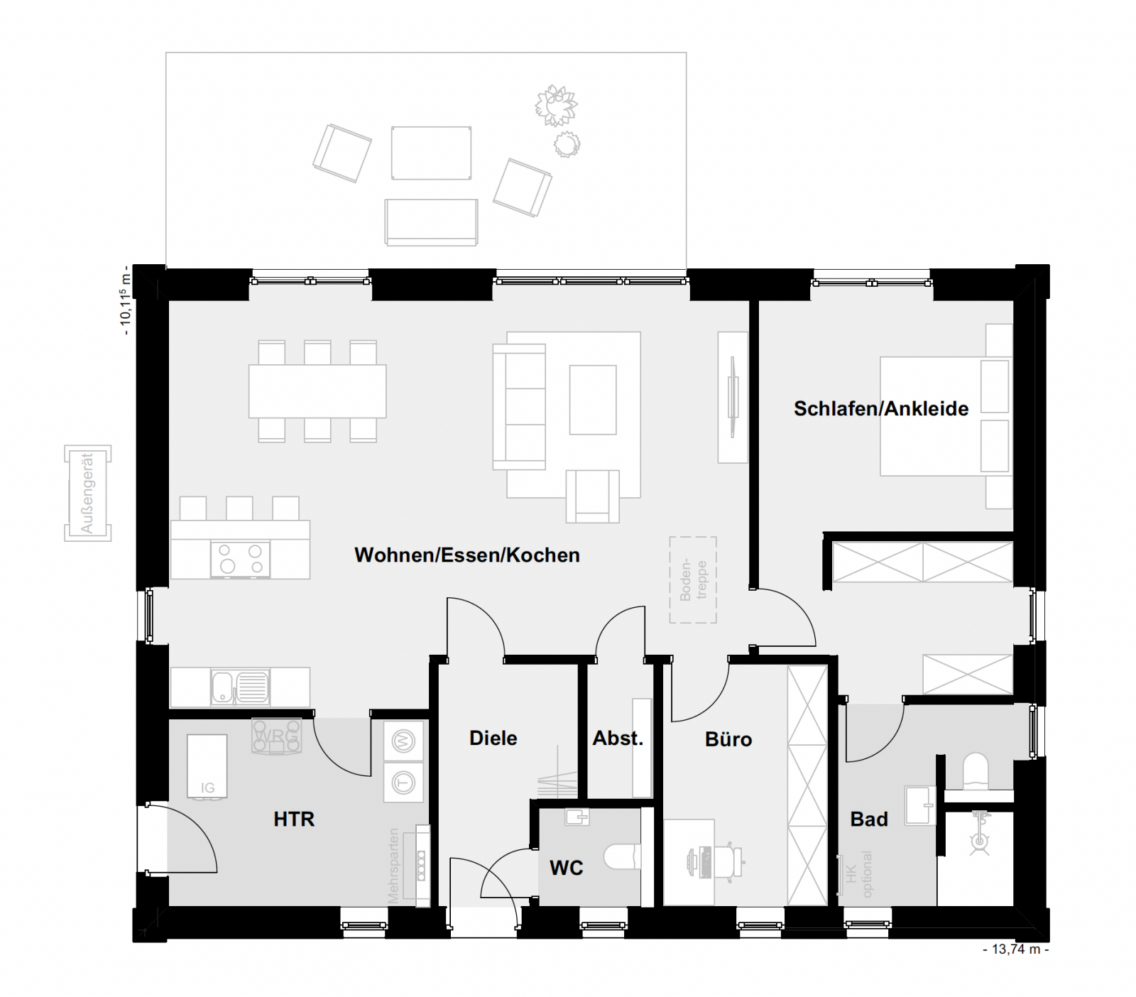 Der Grundriss unseres energieeffizienten Aktionsbungalows ist perfekt durchdacht: Mit dem großen Wohnraum, dem geräumigen Schlafzimmer und einem weiteren Zimmer, das als Büro, Gästezimmer oder zweites Schlafzimmer genutzt werden kann, gibt es Raum für Gemeinschaft, aber auch genügend Rückzugsmöglichkeiten und Privatsphäre. Der Hauswirtschafts- und Technikraum hat einen direkten Gartenzugang, und die Garderobennische im Flur sowie eine extra Abstellkammer sind feine Details der sinnvollen Stauraumplanung.