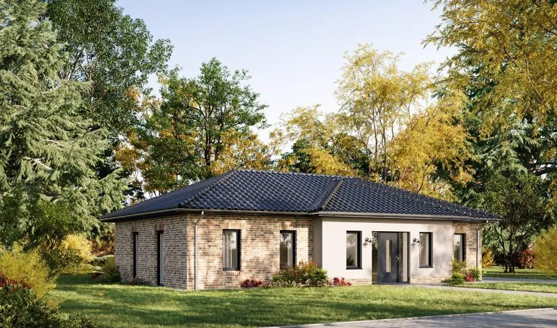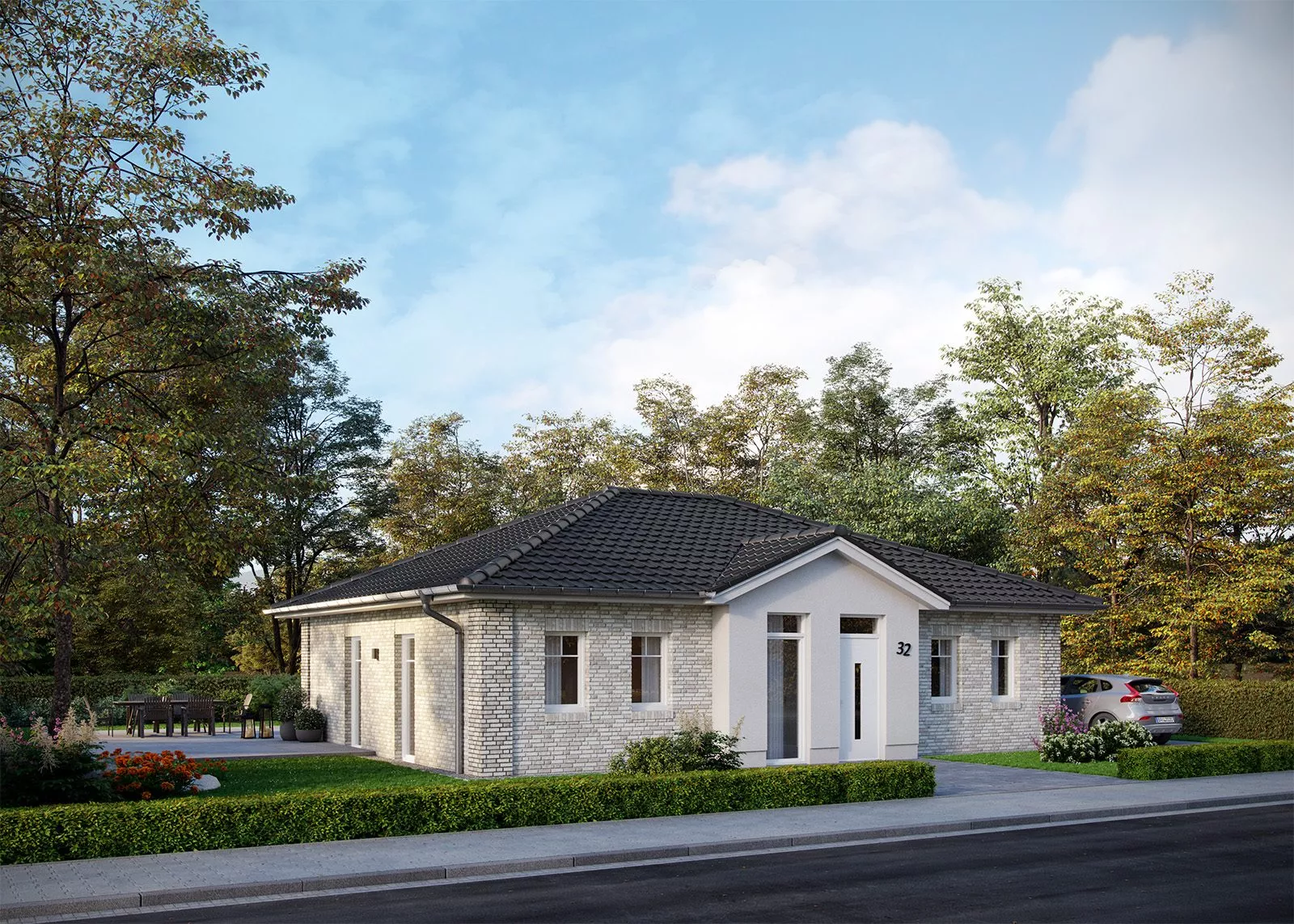Ein Haus mit stilvollem Eingangsportal ist etwas ganz Besonderes und ein Schmuckstück für jede Straße. Bei diesem Bungalow sorgt das extra Giebeldach über dem Entrée für einen sehr guten ersten Eindruck. Innen ist dieses Haus hell, freundlich und wirkt durch den offenen Wohn-, Koch- und Essbereich weitläufig.