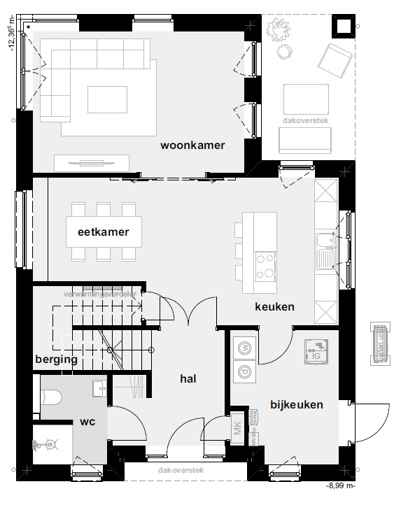Veel ruimte: de woon-, eet- en kookruimtes zijn open. Achter de keuken bevindt zich een bijkeuken met berging en toegang tot de tuin.