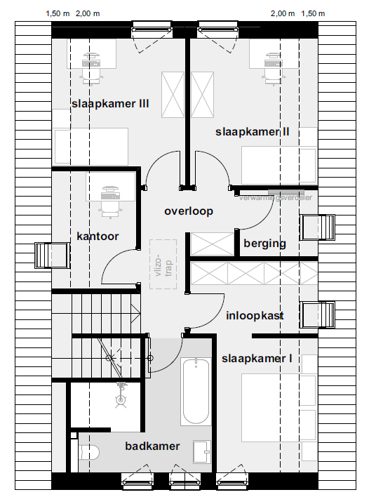 De drie slaapkamers bieden voldoende privacy aan een gezin.
