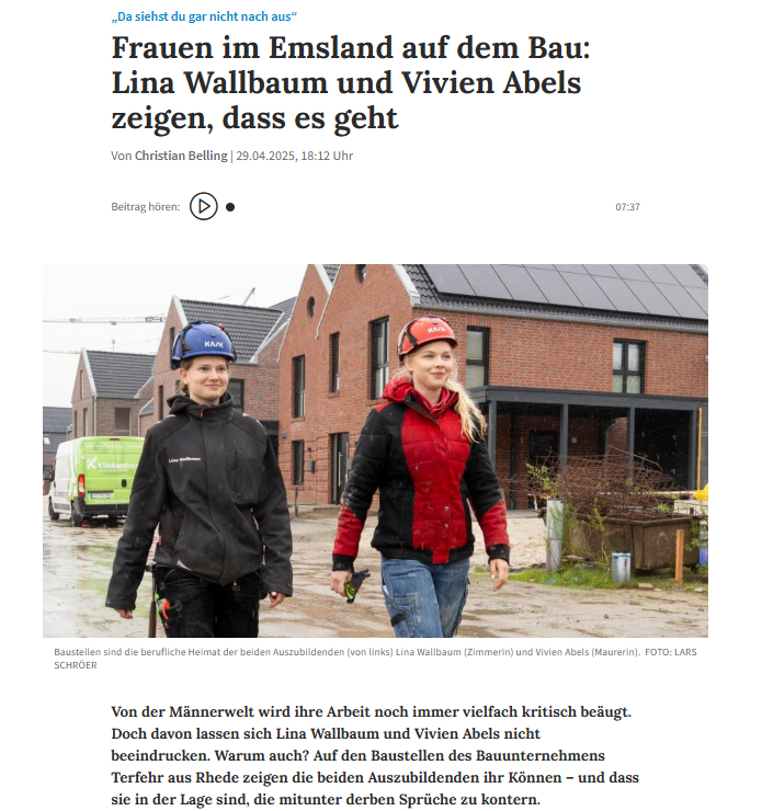 Von der Männerwelt wird ihre Arbeit noch immer vielfach kritisch beäugt. Doch davon lassen sich Lina Wallbaum und Vivien Abels nicht beeindrucken. Warum auch? Auf den Baustellen des Bauunternehmens Terfehr aus Rhede zeigen die beiden Auszubildenden ihr Können – und dass sie in der Lage sind, die mitunter derben Sprüche zu kontern.
